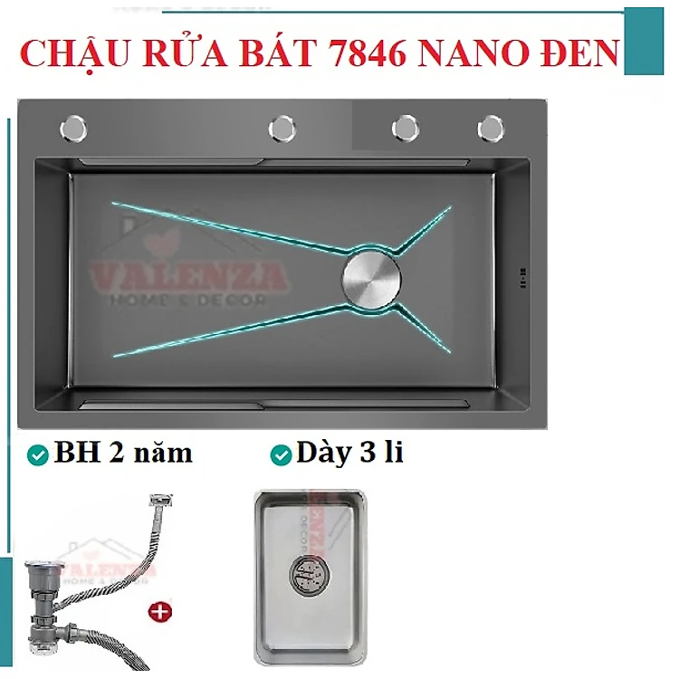 Bồn chậu rửa chén bát 1 hố lớn 78x46cm sus304 nano đen Valenza dày 3,5li kèm chậu phụ inox, bộ xả to ngăn mùi-Hàng chính hãng