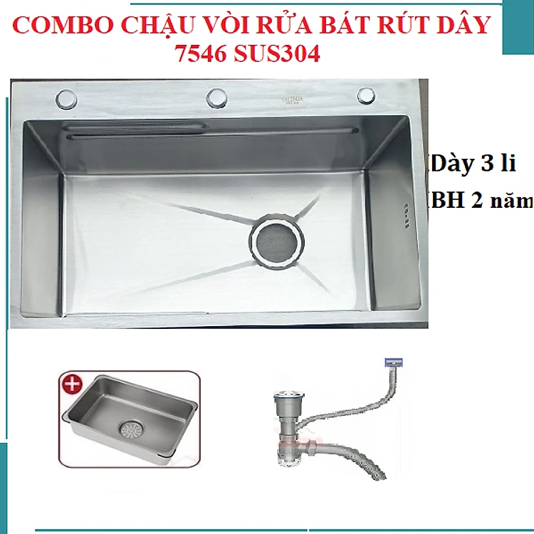 Chậu rửa bát 1 hố sus304 7546 Valenza dày 3li kèm vòi rửa bát rút dây nóng lạnh 01, bộ xả, khay inox, bình nước rửa chén, dụng cụ rửa ly cốc