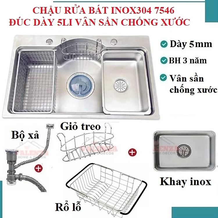 Chậu rửa bát inox304 bán nguyệt ĐÚC dày 5li chống xước 7546 Valenza kiểu dáng Hàn Quốc kèm khay inox, rổ lỗ, bộ xả 18cm-Hàng chính hãng