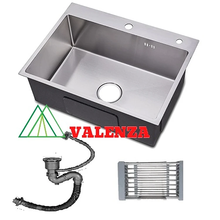 Chậu rửa chén bát inox 1 hố Valenza 6045, kèm rá rau củ, bộ xi phong ống xả chậu