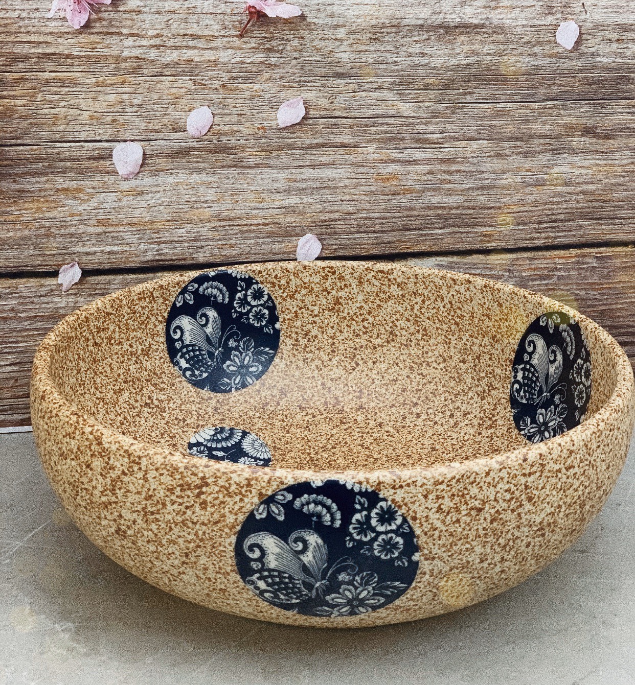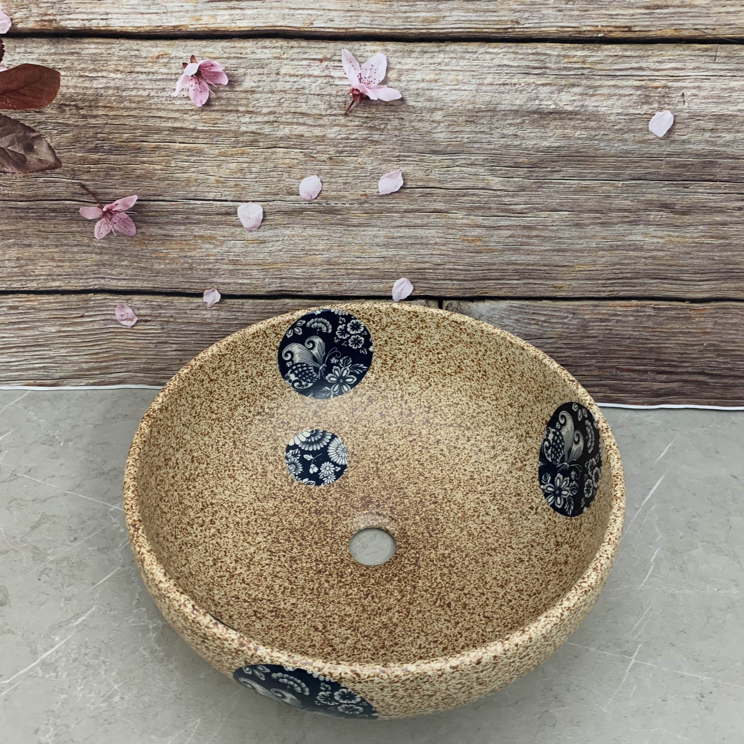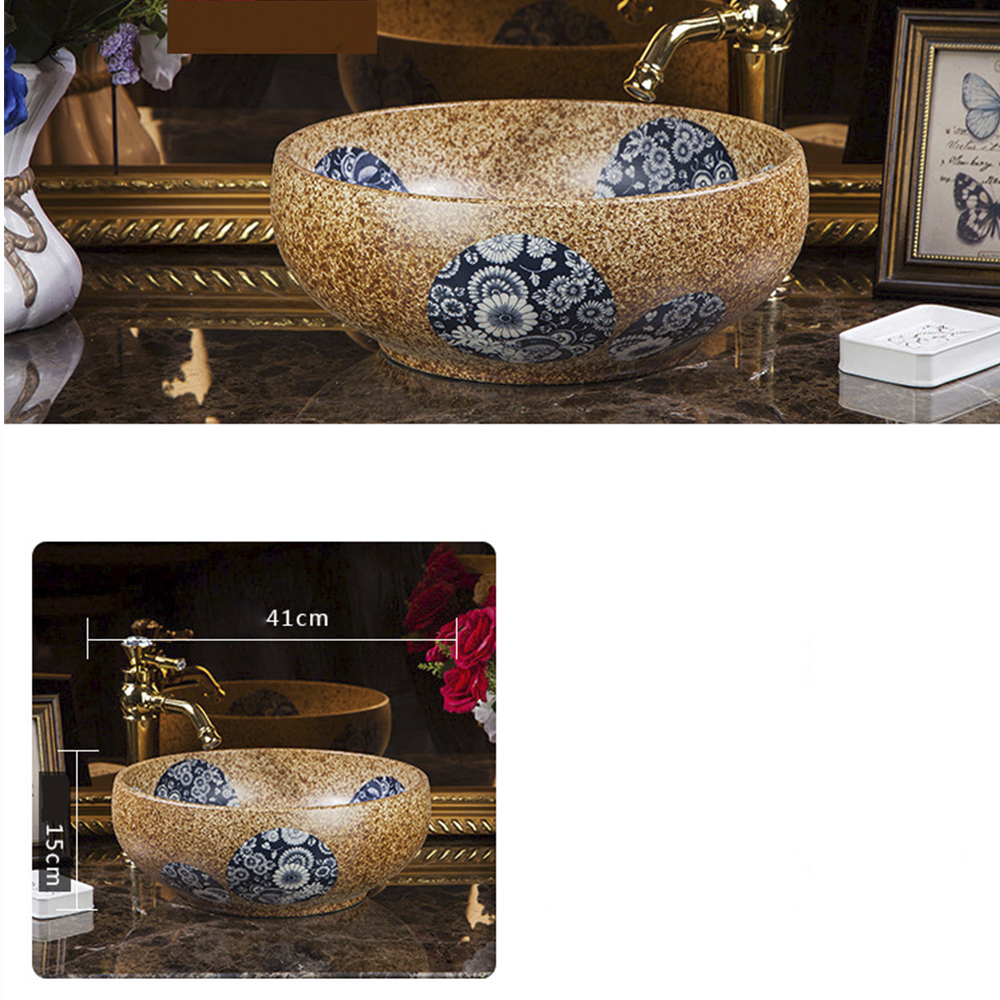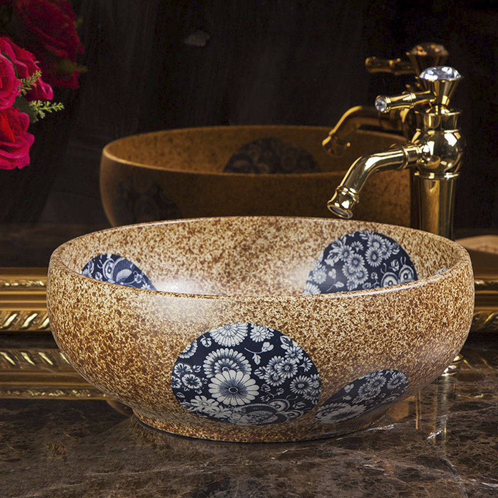 Lavabo gốm sứ cao cấp với thiết kế họa tiết vintage bắt mắt, đường nét hoa văn uyển chuyển, mềm mại trên nền màu trầm ấm. Lớp tráng men bóng mịn, sắc nâu tinh tế kết hợp cùng sắc đen huyền bí tạo nên điểm nhấn đặc biệt trong không gian phòng tắm.