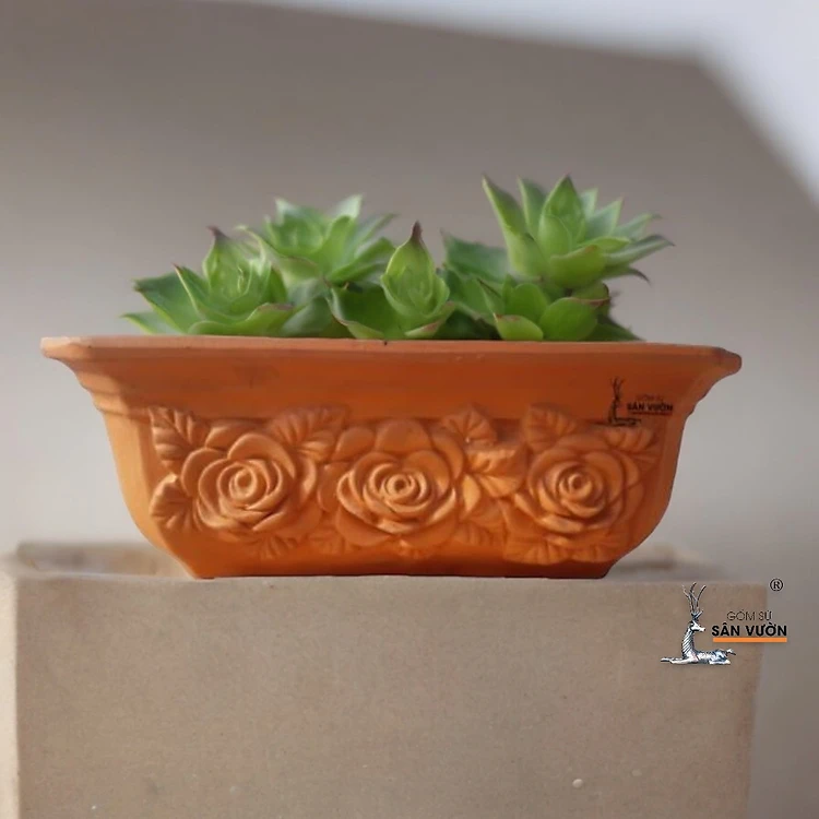 Chậu Treo Tường Đất Nung Hình Chữ Nhật Vân Hoa Hồng