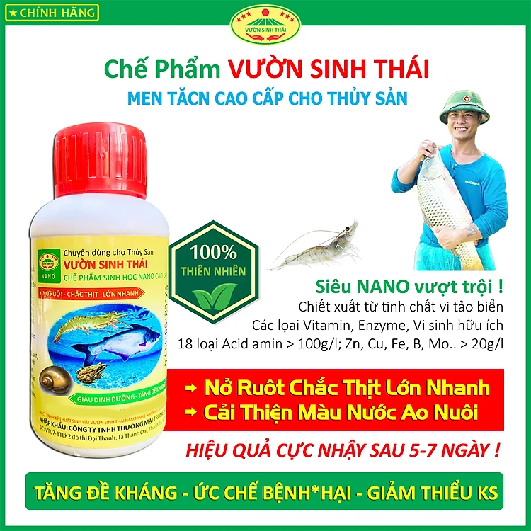 Chế phẩm sinh học VƯỜN SINH THÁI cho Tôm, Cá, Ếch. Nở ruột, chắc thịt, lớn nhanh. Vi sinh NANO siêu vượt trội. Hiệu quả ngay sau 5-7 ngày. HSD: 4 năm