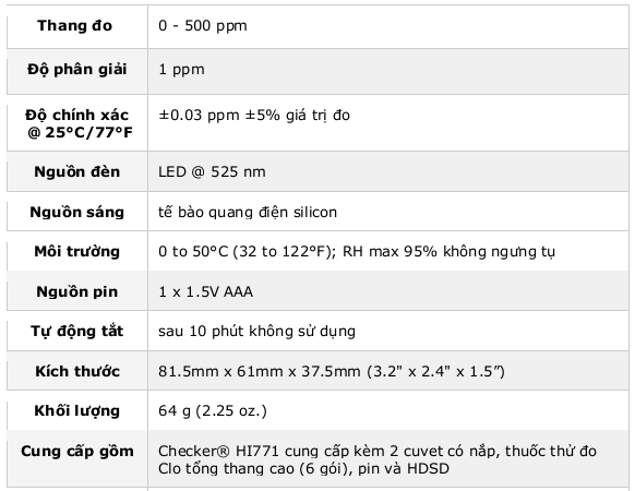 CheckerHC HI771 cho kết quả đo chính xác và chi phí thấp để đo Clo Thang Cao. Clo là một chất khử trùng phổ biến được sử dụng trong nhiều ngành công nghiệp kể cả dùng để rửa trái cây và rau quả, khử trùng dụng cụ y tế, thiết bị tạo clo. Được thiết kế như một giải pháp chính xác hơn để dụng cụ kiểm tra hóa học, HI771 cung cấp kết quả nhanh chóng, chính xác trong bốn bước đơn giản: