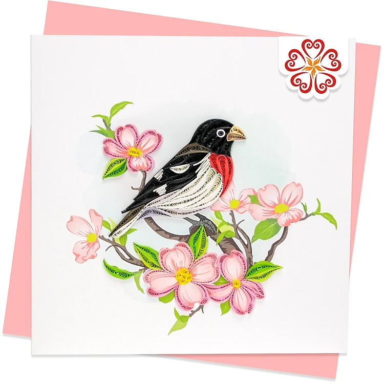 Chim tước mỏ lớn ngực đỏ và hoa thù du hồng - Thiệp giấy xoắn 15 x 15 cm