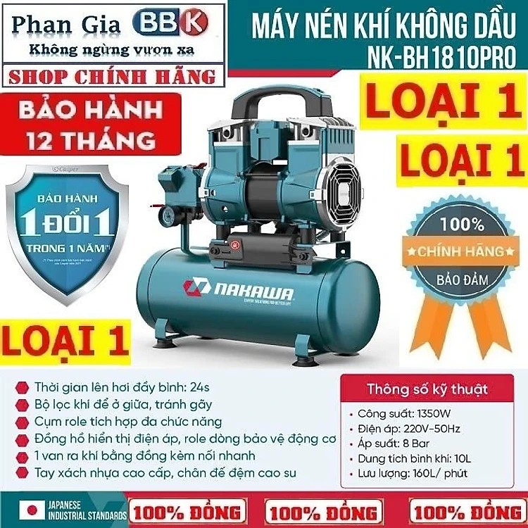 [chính hãƞg] Máy nén khí không dầu NAKAWA 10L - 1350W, tốc nhanh, siêu êm, 100% dây đồng, Bảo hành 1 năm