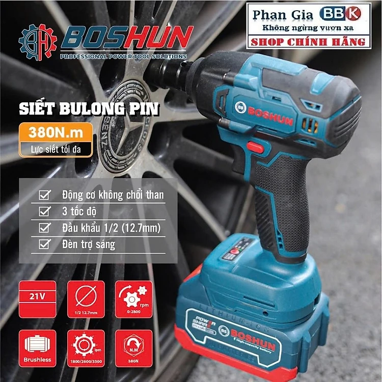 [chính hãƞg] Máy Siết Bulong Pin BOSHUN BS-IW380N, Lực siết 380Nm - Đầu 2in1 - Tặng 24 phụ kiện, Bảo hành 12 tháng