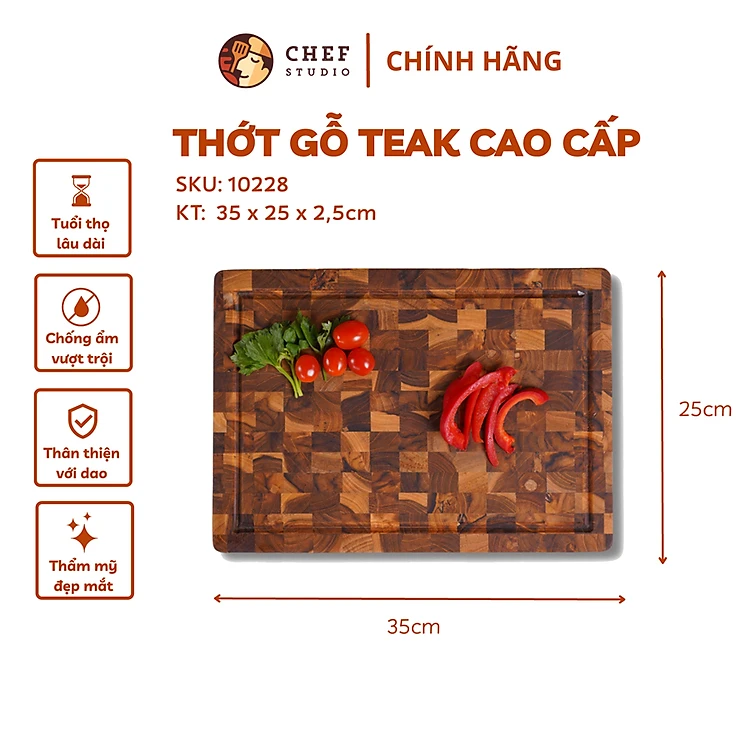[Chính hãng] Thớt gỗ Teak Chef Studio hình chữ nhật 25x35x2,5 cm - MSP 10228. Dùng cắt, thái, khay trưng bày thực phẩm.