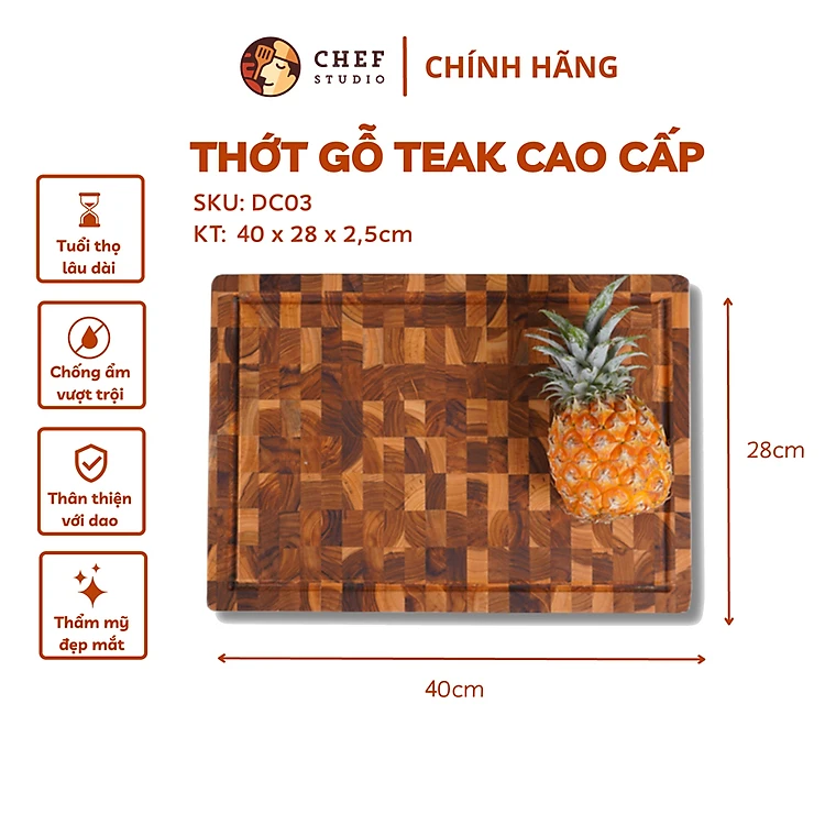 [Chính hãng] Thớt gỗ Teak Chef Studio hình chữ nhật 40x28x2,5 cm - MSP DC03 Dùng cắt, thái, bằm, chặt, bày thực phẩm.