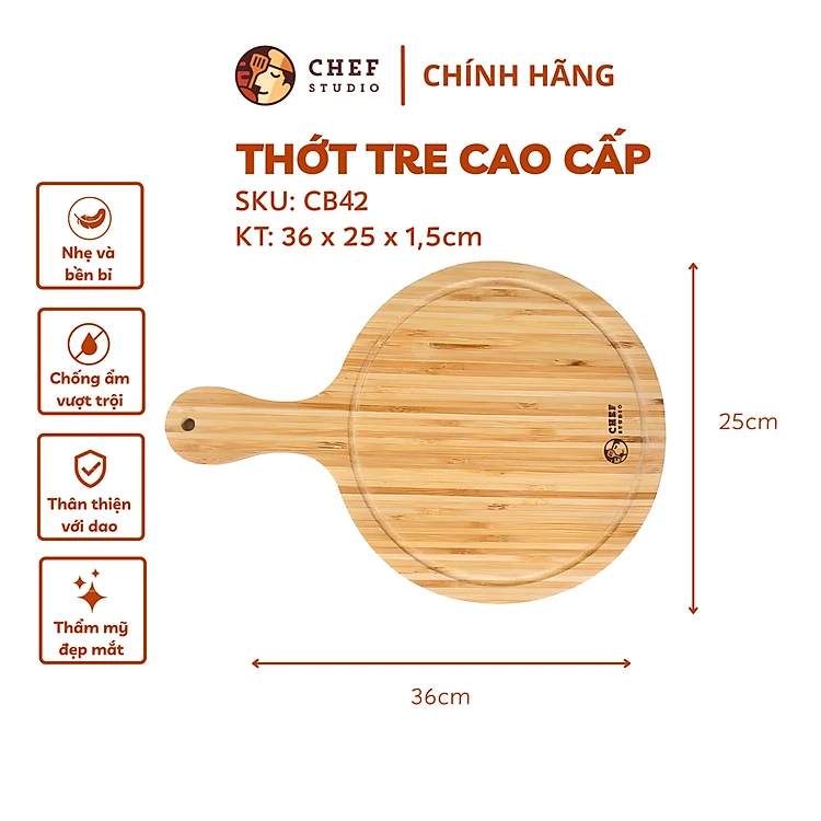 [Chính hãng] Thớt tre Chef Studio hình tròn có tay cầm 36x25x1.5cm, MSP-CB42. Cắt, thái rau củ, dùng decor, bày trí.