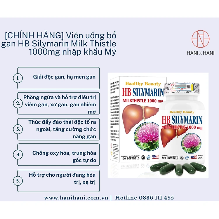 [CHÍNH HÃNG] Viên uống bổ gan HB Silymarin Milk Thistle 1000mg nhập khẩu Mỹ, chiết xuất cây kế sữa tăng cường chức năng gan, hạ men gan, giải độc gan hộp 100 viên