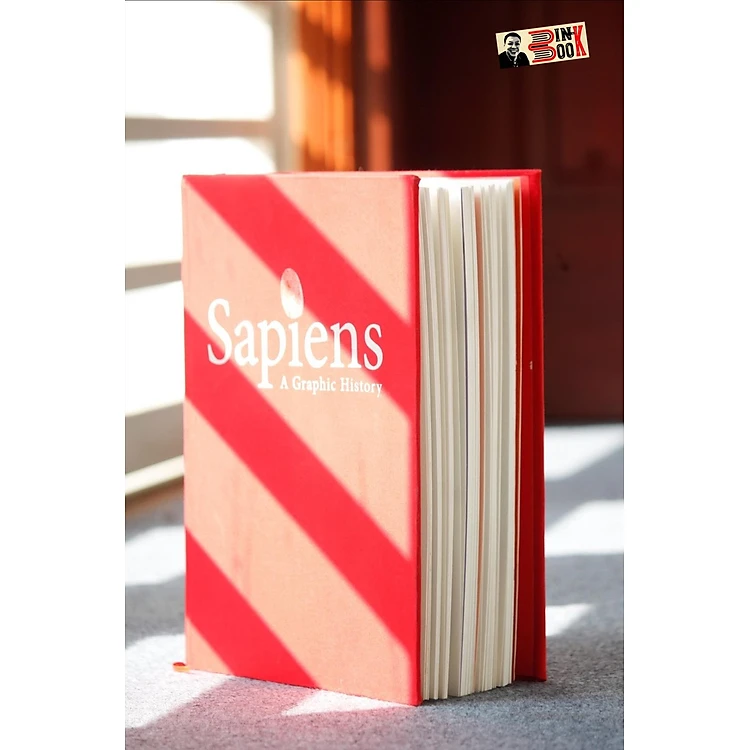 Bìa cứng bọc vải màu đỏ, in nhũ bạc chữ Sapiens