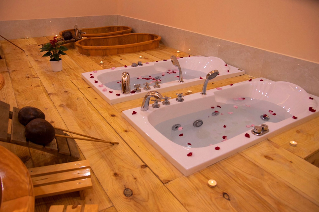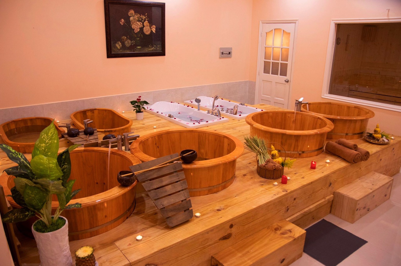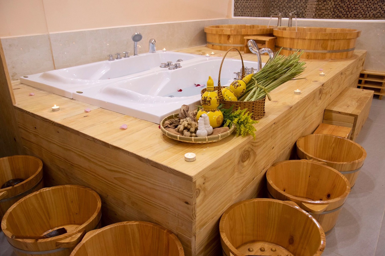 Bước 1:  Tắm tráng, tạo màng nước quanh cơ thể,giúp làn da hấp thụ tốt hơn các khoáng chất có ở nước thuốc và hơi nóng truyền vào cơ thể đều hơn,không bị nóng gắt trong quá trình ngâm bồn gỗ thuốc bắc,xông hơi