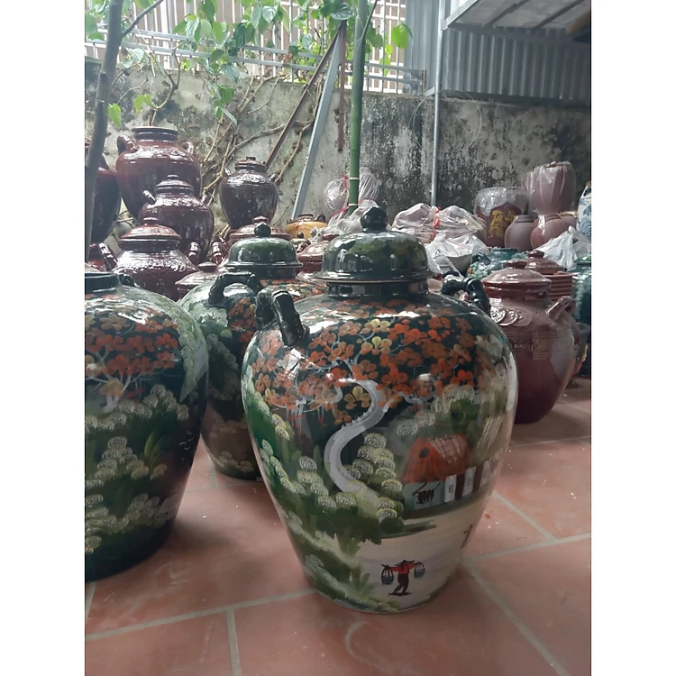 Chum sành men lam vẽ đồng quê 50 lít cao 65 cm rộng 48 cm