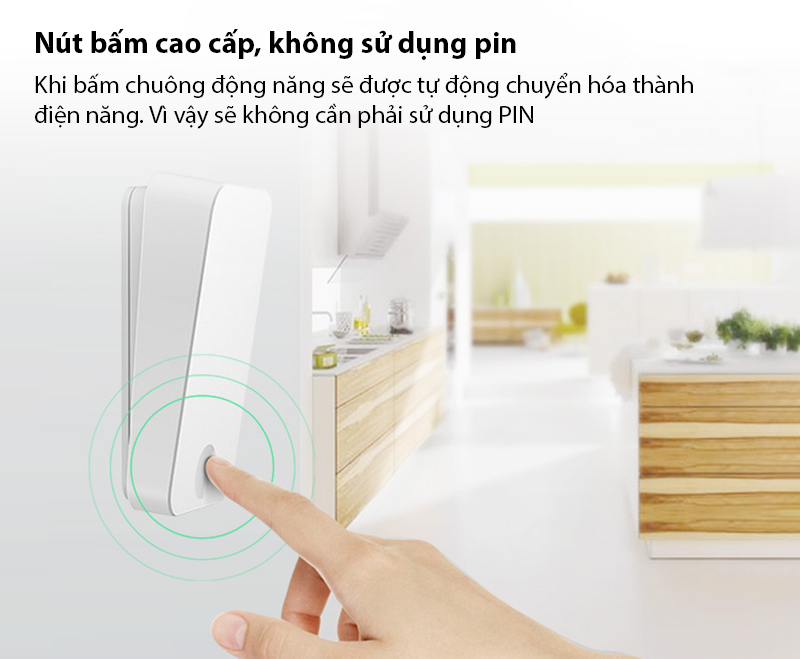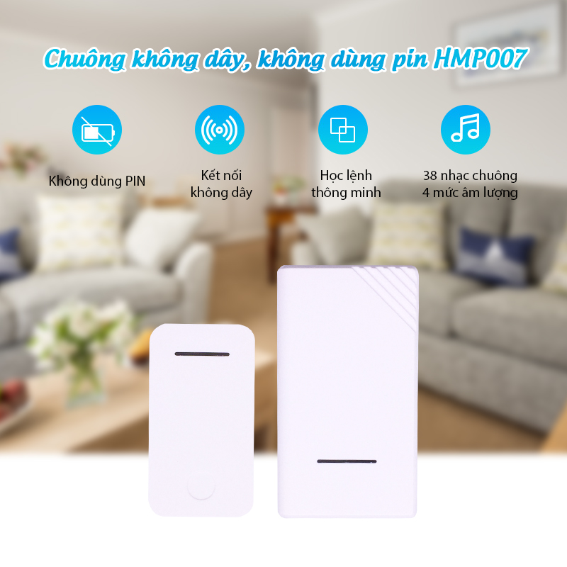 Thêm vào đó, nút bấm của HBM007 cũng không dùng pin, không hề tốn chi phí để mua pin, gây ô nhiễm môi trường sống. Khi ấn lên bộ phát, năng lương cơ này sẽ tự động chuyển thành điện năng để tạo ra tín hiệu truyền đến loa chuông.