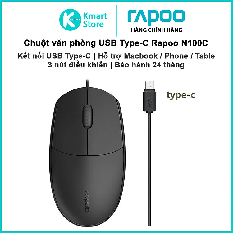 Chuột có dây Rapoo N100C | Kết nối USB Type-C hỗ trợ Macbook / Phone / Table | Bảo hành 24 tháng | Hàng Chính Hãng