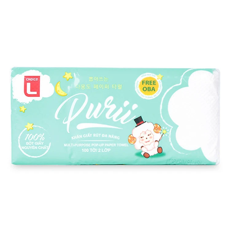 - Khăn Giấy Rút Đa Năng Purri Choice L (100 Tờ) được làm từ bột giấy nguyên chất 100%, giấy mềm mịn, thấm hút tốt và mang lại cảm giác thoải mái cho người sử dụng.