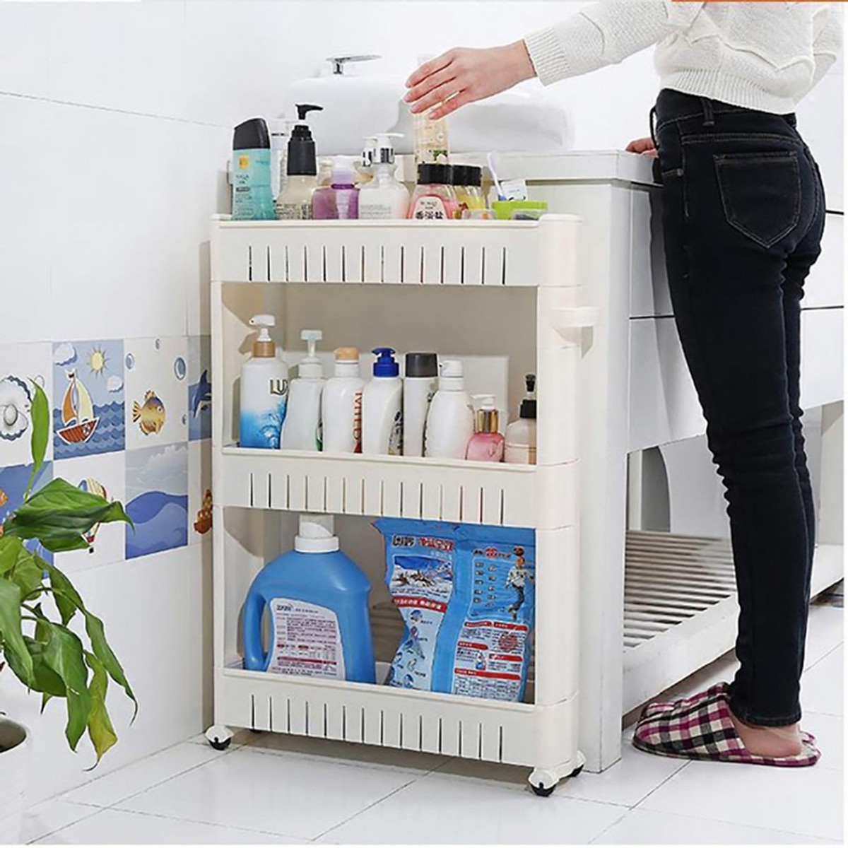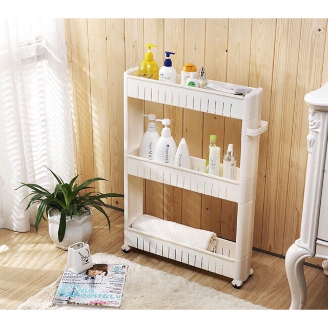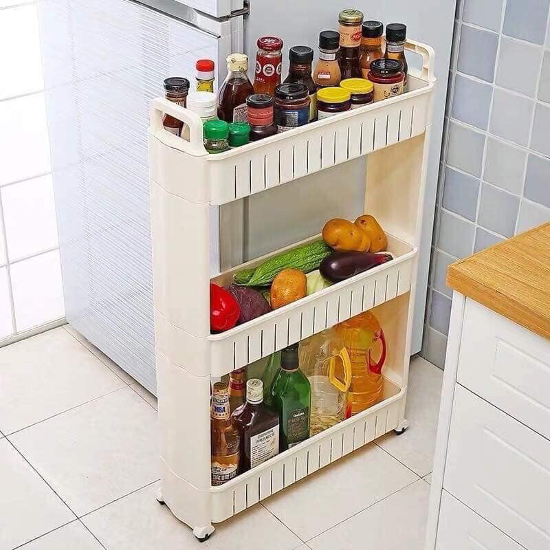 - Kệ đựng đồ đa năng 3 tầng có bánh xe với thiết kế cực kỳ thông minh giúp bạn tận dụng những khe nhỏ nhất trong nhà như giữa 2 khe tủ hoặc bất kỳ góc nhỏ nào để đựng đồ.