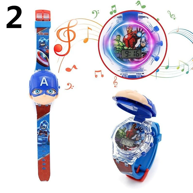 (Có đèn + nhạc) Đồng Hồ Điện Tử có đèn led phát sáng và âm thanh cho trẻ em bé trai hoạt hình siêu nhân người nhện đội trưởng siêu anh hùng