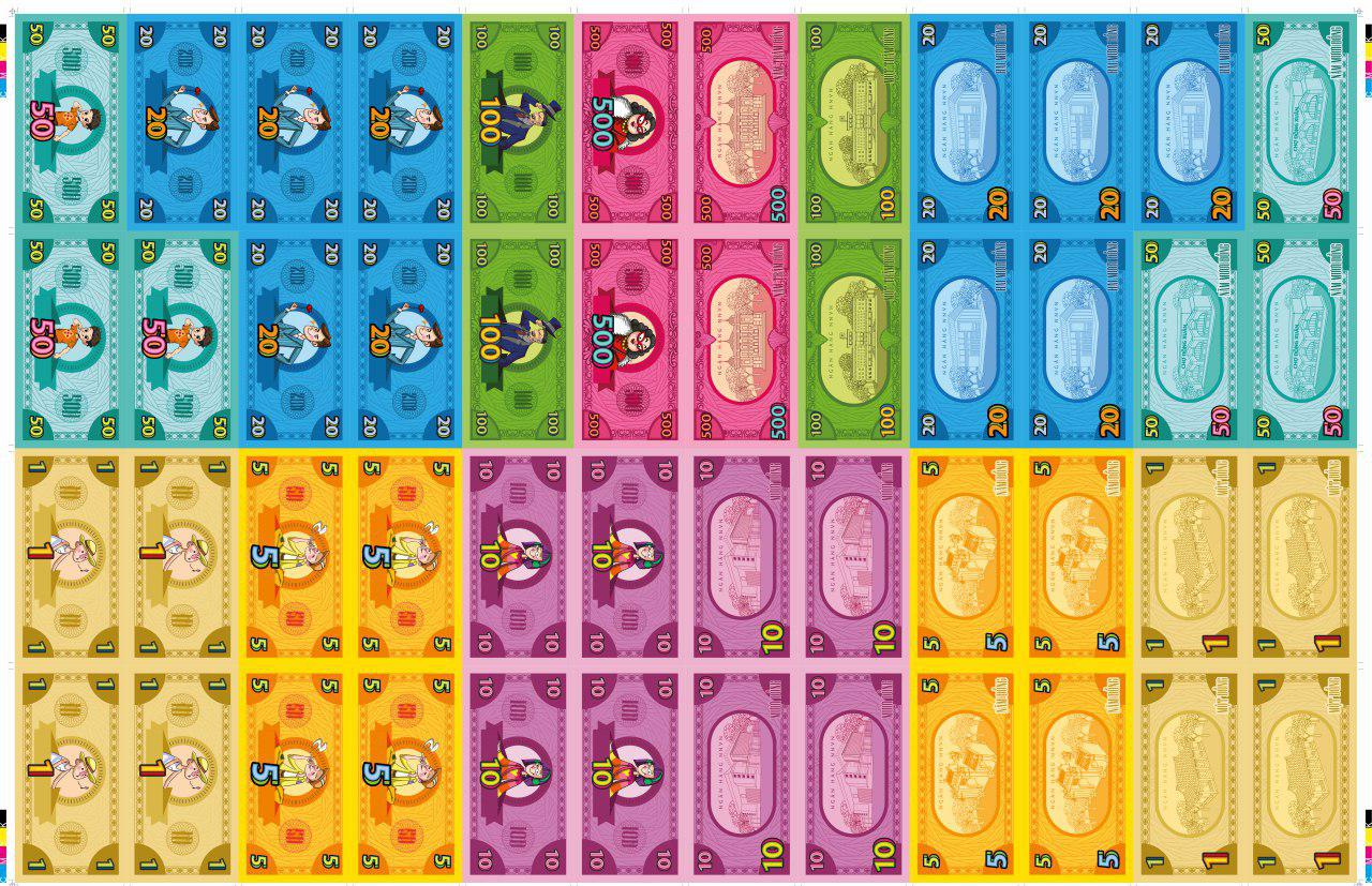 - Chìa tiền: Mỗi người 1,500đ gồm có: 5 từ 1đ, 1 tờ 5đ, 2 tờ 10đ, 1 tờ 20đ, 1 tờ 50đ, 4 tờ 100đ, 2 tờ 500đ, phần tiền còn lại dùng làm ngân hàng, nếu bạn muốn chơi nhanh thì setup chia mỗi người 2,500đ