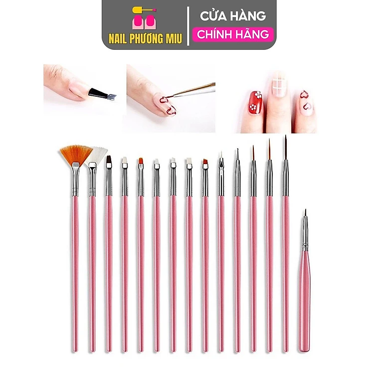 Cọ Vẽ Móng Làm Nail Sét 15 Cây Cán Nhựa Abs, Tay Cầm Không Gỉ, Đầu Lông Mềm Dẻo Đen Hồng Dài 14cm Tạo Mẫu Móng - Nail Phương Miu