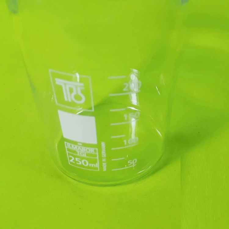 Cốc Đong Thủy Tinh Trong Suốt Chịu Nhiệt Duran - Có Chia Vạch (250ml) được dùng để định lượng hóa chất theo thể tích với độ chính xác cao, dùng trong pha chế hỗn hợp.