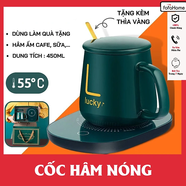 Cốc Hâm Nóng, Bộ Ly Sứ Kèm Đế Điện Hâm Nóng Trà, Cafe, Hâm Sữa + Tặng Kèm Thìa Vàng, Hộp Sang Trọng, Bộ Cốc Sứ Tiện Lợi