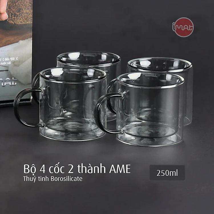 [Cốc IMAT] Bộ 4 Cốc Thủy Tinh AME 250ml High Borosilicate Hai Lớp Cách Nhiệt Cao Cấp