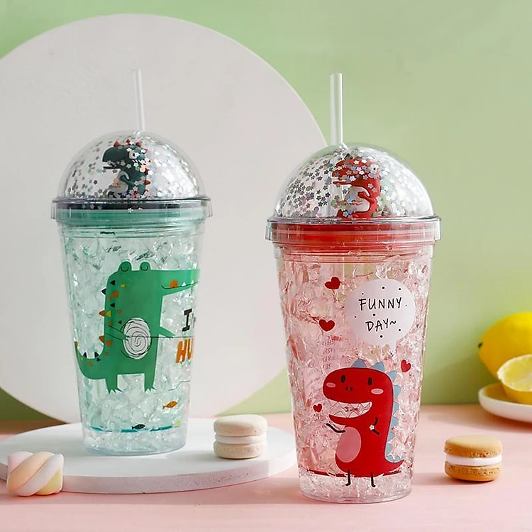 ĐẶC ĐIỂM SẢN PHẨM Cốc Uống Nước Cute Có Nắp Và Ống Hút 500ml, Ly Uống Nước Họa Tiết Kim Tuyến Khủng Long Dễ Thương