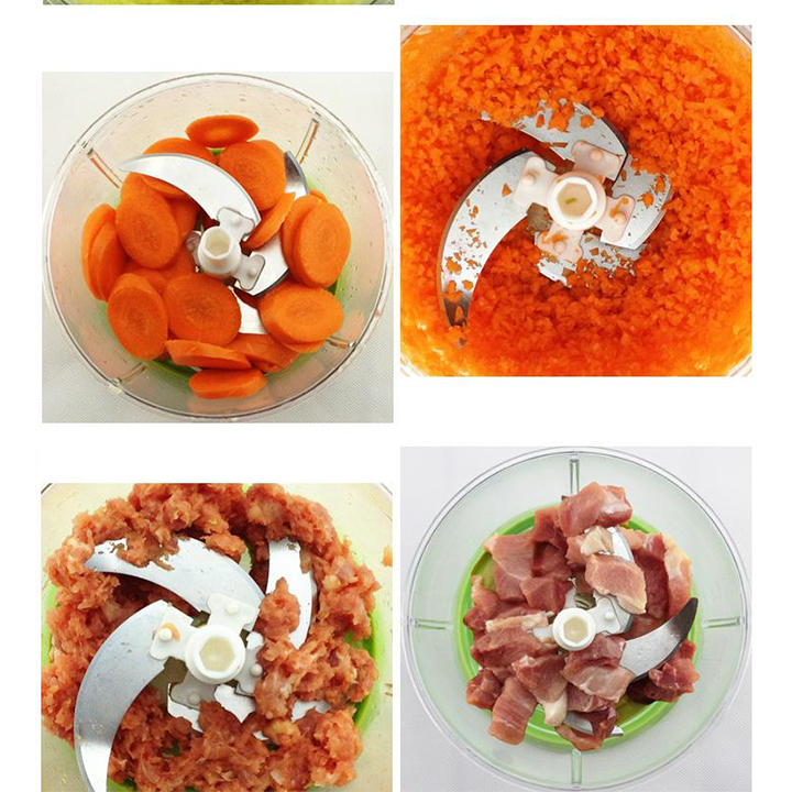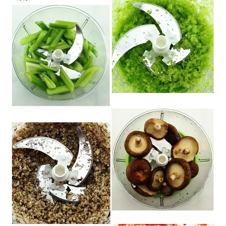 - Cách sử dụng đơn giản chỉ cần cho rau củ vào cối đậy nắp và kéo dây là lưỡi cắt sẽ quay 7 lần để nghiền nát thực phẩm.
