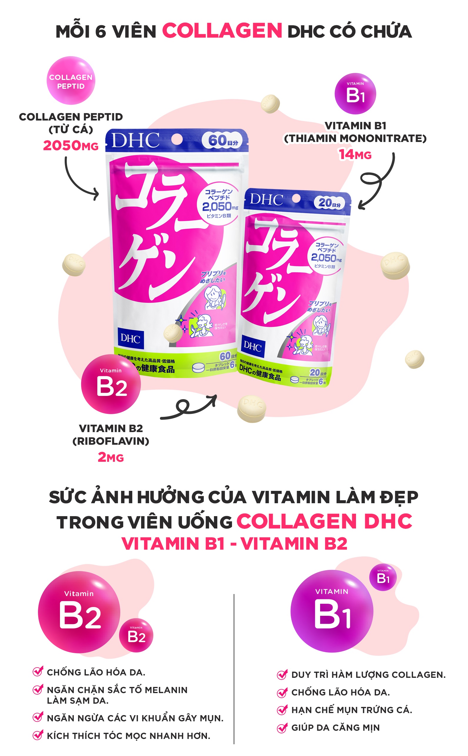 Mỗi 6 viên có chứa: collagen peptid (từ cá): 2050mg; vitamin B1: 14mg; vitamin B2: 2mg.