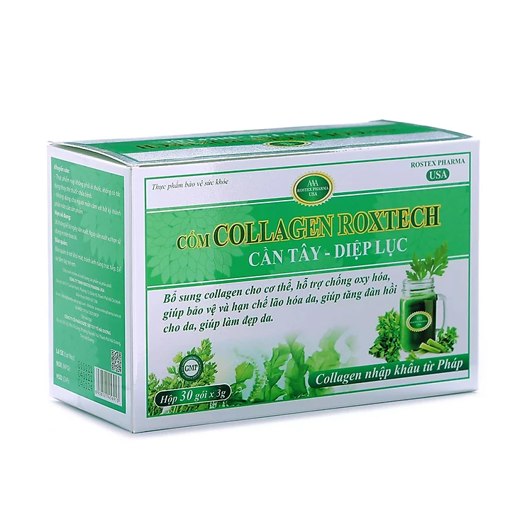 Cốm Collagen Roxtech Cần Tây Diệp Lục sáng da, chống lão hóa, mờ thâm sạm - Hộp 30 gói