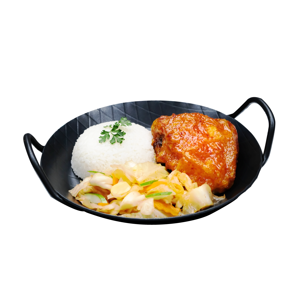 Phần ăn dành cho 1 người, bao gồm cơm gạo Nhật, 1 má đùi gà phủ xốt cay/mật ong/tỏi (tùy chọn) dùng kèm với kim chi