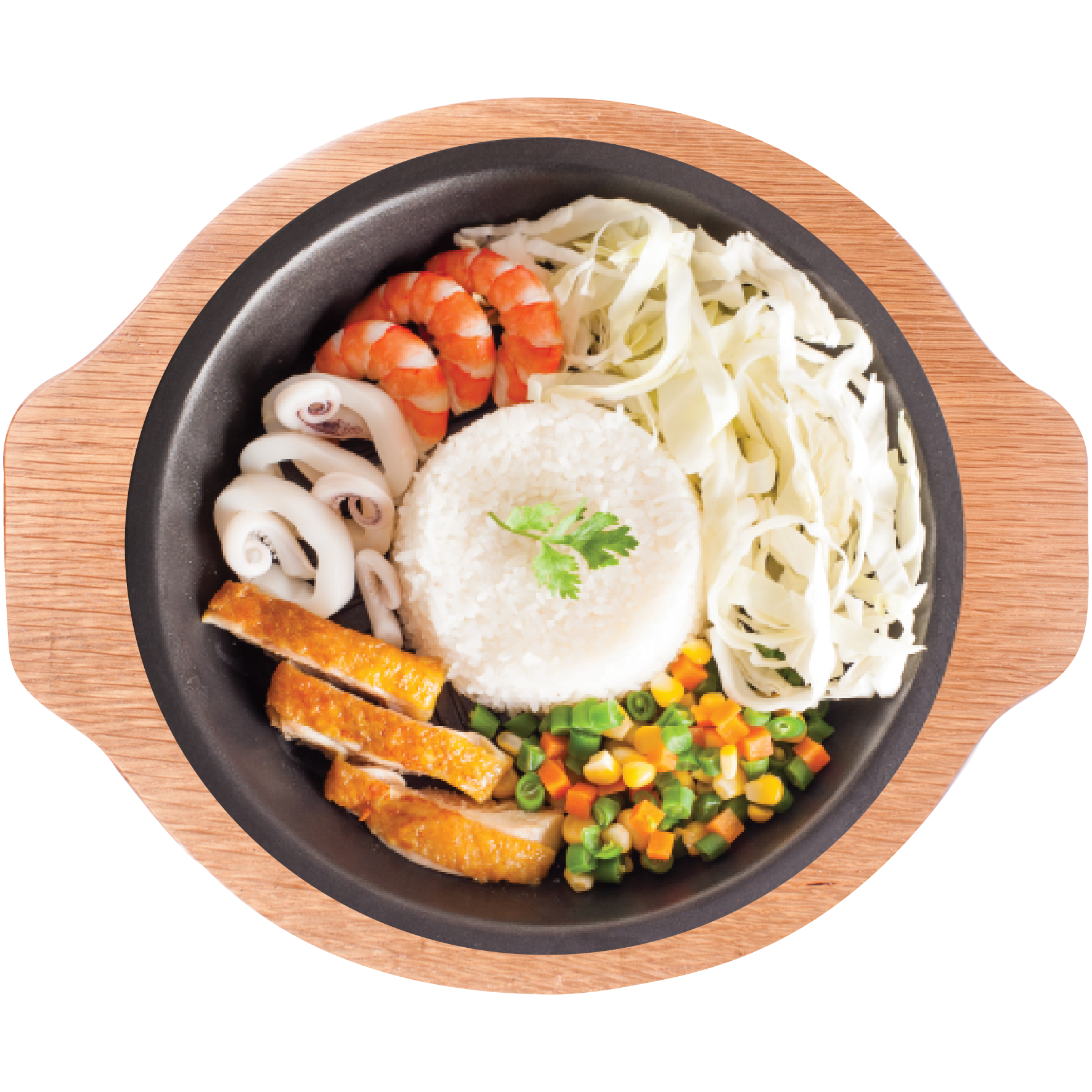 Phần ăn dành cho 1 người, bao gồm cơm, các loại rau củ, tôm, mực và gà cắt phi lê dùng kèm với các loại xốt trên menu