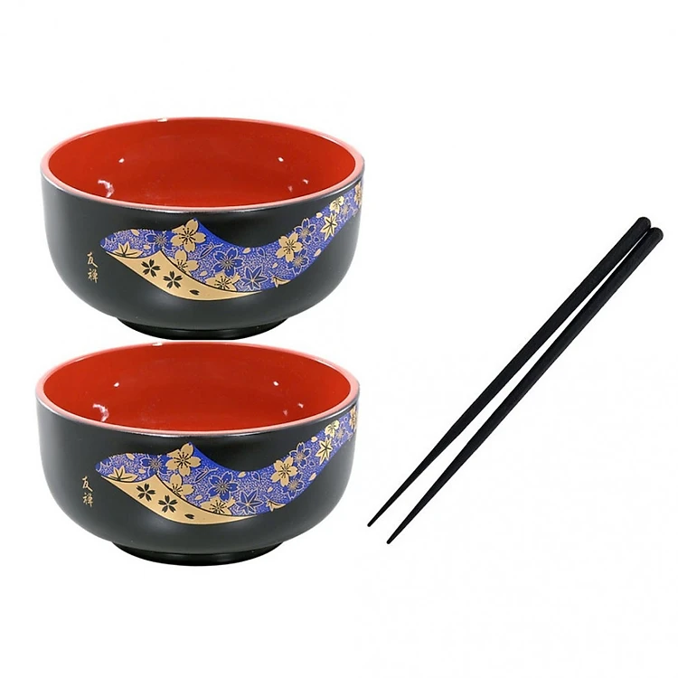 Combo 02 chén ăn cơm tròn màu đen lòng đỏ + 01 đôi đũa Tanaka 22,5cm  màu đen hàng nội địa Nhật Bản