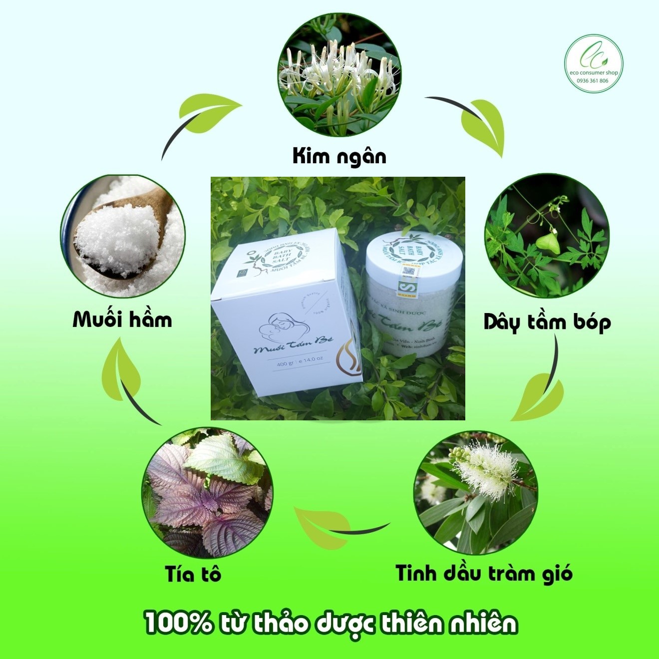 + Thành phần : Muối biển, chiết xuất dây Kim Ngân, dây Tầm Bóp và Tía tô, Tinh dầu Tràm Gió.