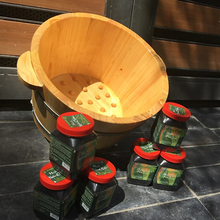 Ngâm chân bằng chậu gỗ kết hợp với Muối ngâm chân sinh dược mang lại những tác dụng tuyệt vời cho sức khỏe.