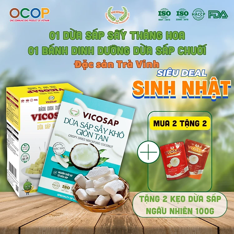 Combo 1 Dừa sáp sấy giòn VICOSAP 1 Bánh dừa sáp chuối ít đường đồ ăn vặt healthy đặc sản Trà Vinh