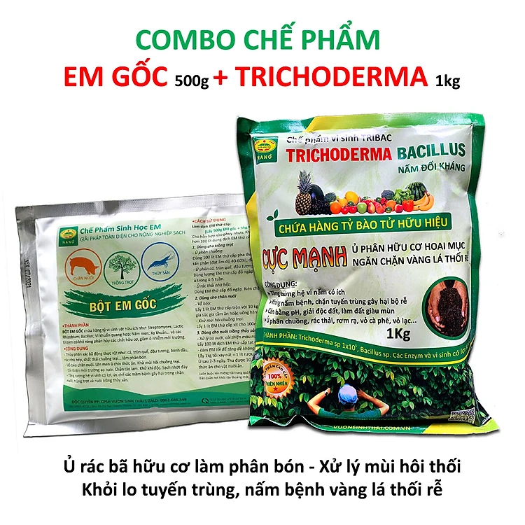 Combo 1 gói Chế phẩm EM gốc và 1kg Nấm đối kháng Trichoderma TRIBAC. Ủ phân cá, rác bã hữu cơ hoai mục nhanh không mùi hôi. Ngăn chặn nấm bệnh gây thối rễ vàng lá
