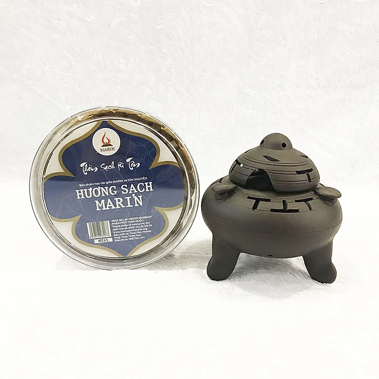 - Đốt đầu nhỏ của nụ hương Marin cháy đượm bằng cách cầm nụ hương nghiêng góc 45 độ. Sau đó, đặt nụ hương đứng vào giữa lòng bình xông, đậy nắp lại. Đặt bình xông ở góc phòng, góc nhà hay trên bàn thờ tùy ý.