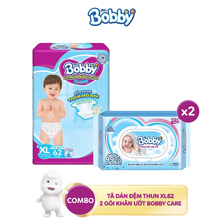 Combo 1 Tã dán Bobby đệm thun thấm mồ hôi đủ size và 2 Gói khăn ướt trẻ em Bobby care không hương 100 tờ