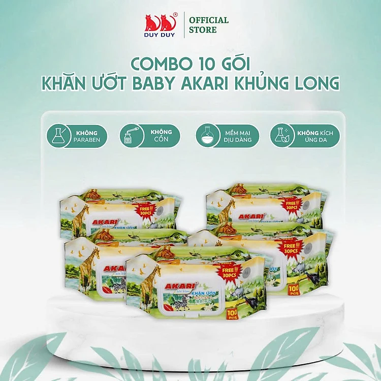 Combo 10 gói Khăn ướt Akari khủng long vải không dệt rayon cao cấp 130 miếng (13.5x20cm) không paraben dành cho bé