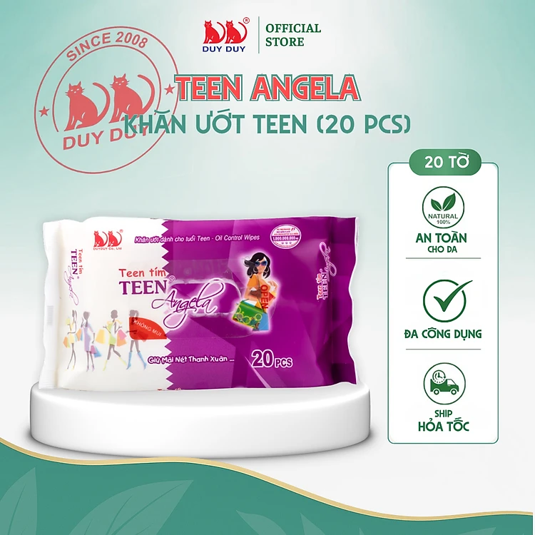 Combo 10 gói Khăn ướt tuổi teen Angela tím 20pcs, thích hợp tuổi teen, cho gia đình và đi dã ngoại