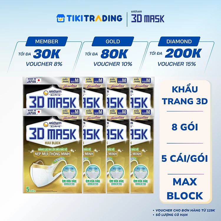 Combo 8 gói Khẩu trang Unicharm 3D Mask nẹp mũi siêu bảo vệ size M (5 cái/gói)