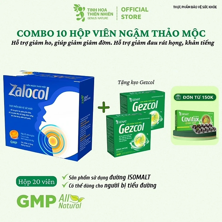 Combo 10 hộp viên ngậm ho thảo mộc Zalocol Hỗ trợ giảm đờm, giảm đau rát họng, khản tiếng do viêm họng, viêm phế quản (Hộp 20 viên) tặng túi gừng- Genat