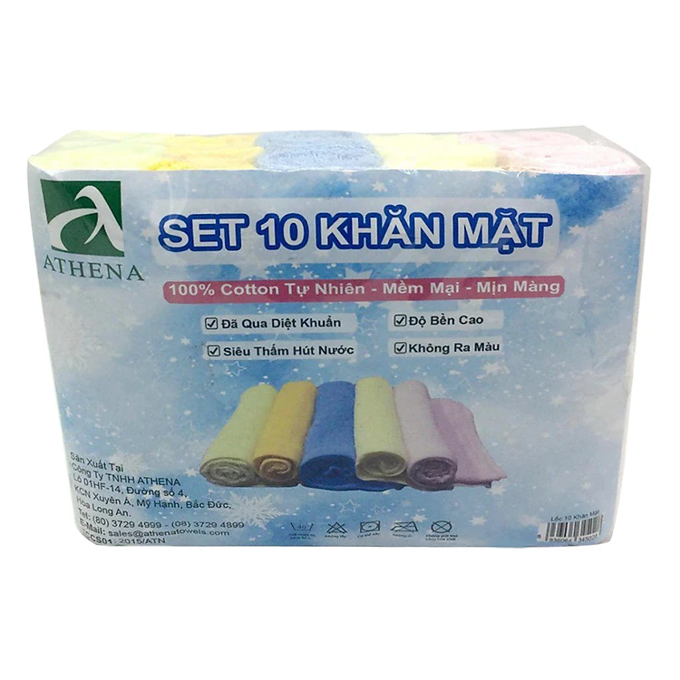 - Combo 10 Khăn Mặt Nhiều Màu Athena được làm từ chất liệu bông cotton mềm mại, thấm hút tốt, đảm bảo an toàn cho sức khỏe người sử dụng.