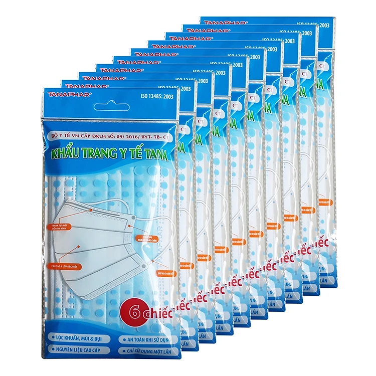 - Combo 10 Túi Khẩu Trang Y Tế Tana Sử Dụng 1 Tuần (6 Cái / Túi) được cấu tạo bởi 3 lớp, lớp vải lọc khí không thấm nước, thoáng khí, không gây dị ứng da.