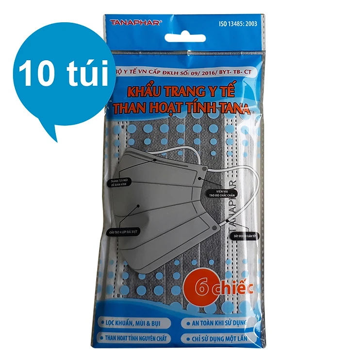 - Combo 10 Túi Khẩu Trang Y Tế Than Hoạt Tính Tana Sử Dụng 1 Tuần (6 Cái / Túi) thiết kế tiện lợi cho người dùng, đáp ứng đủ số lượng khẩu trang cần có trong 1 tuần.