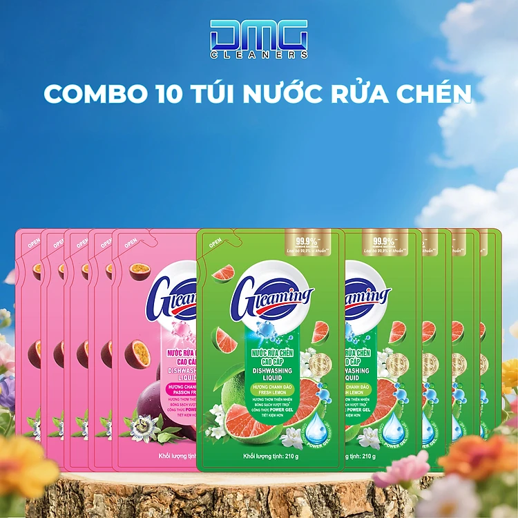 Combo 10 Túi Nước Rửa Chén Gleaming Hương Chanh Đào + Chanh Dây 200ml (5 Chanh Đào + 5 Chanh Dây)200ml/Túi