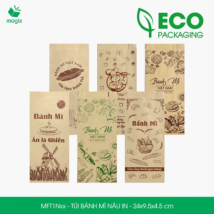 Combo 100 Túi bánh mì Nâu 24x9.5x4.5 cm - In sẵn họa tiết nhiều mẫu - Bao bánh mì Túi giấy thực phẩm an toàn